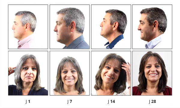 Après 14 jours, on a constaté 47% de cheveux blancs en moins chez 100% des volontaires et ce nombre passe à 78% après 28 jours.
